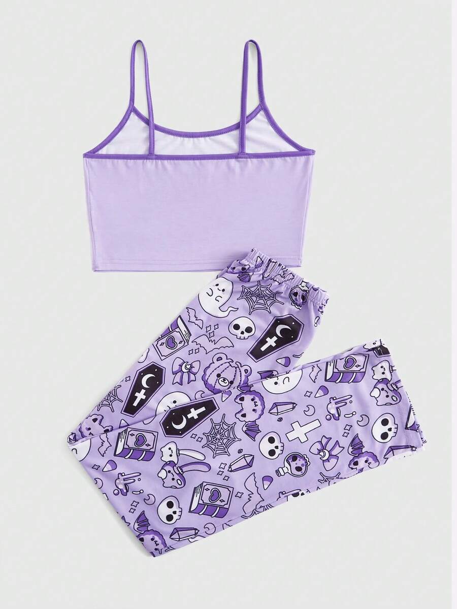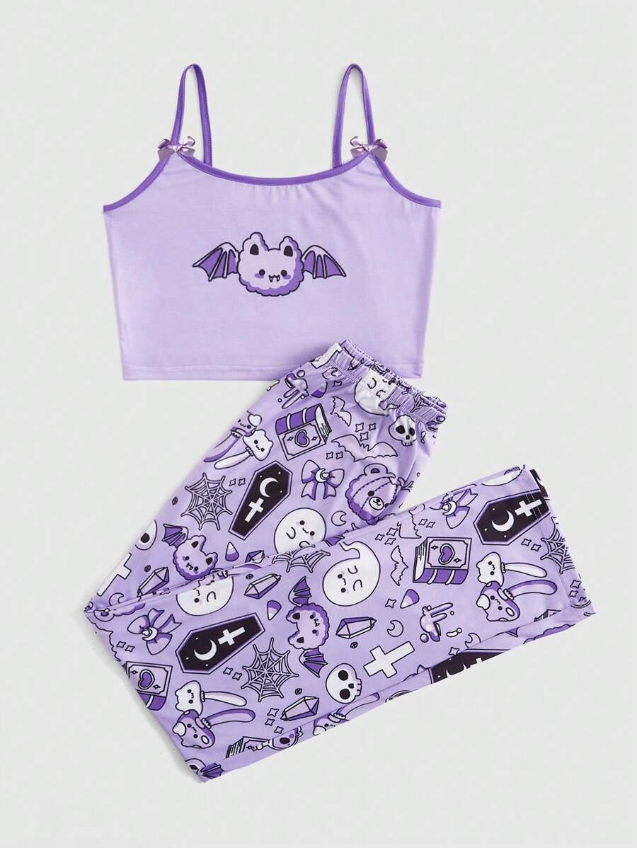 Kawaii Cartoon Graphic Ringer Cami & Pants PJ Set