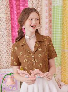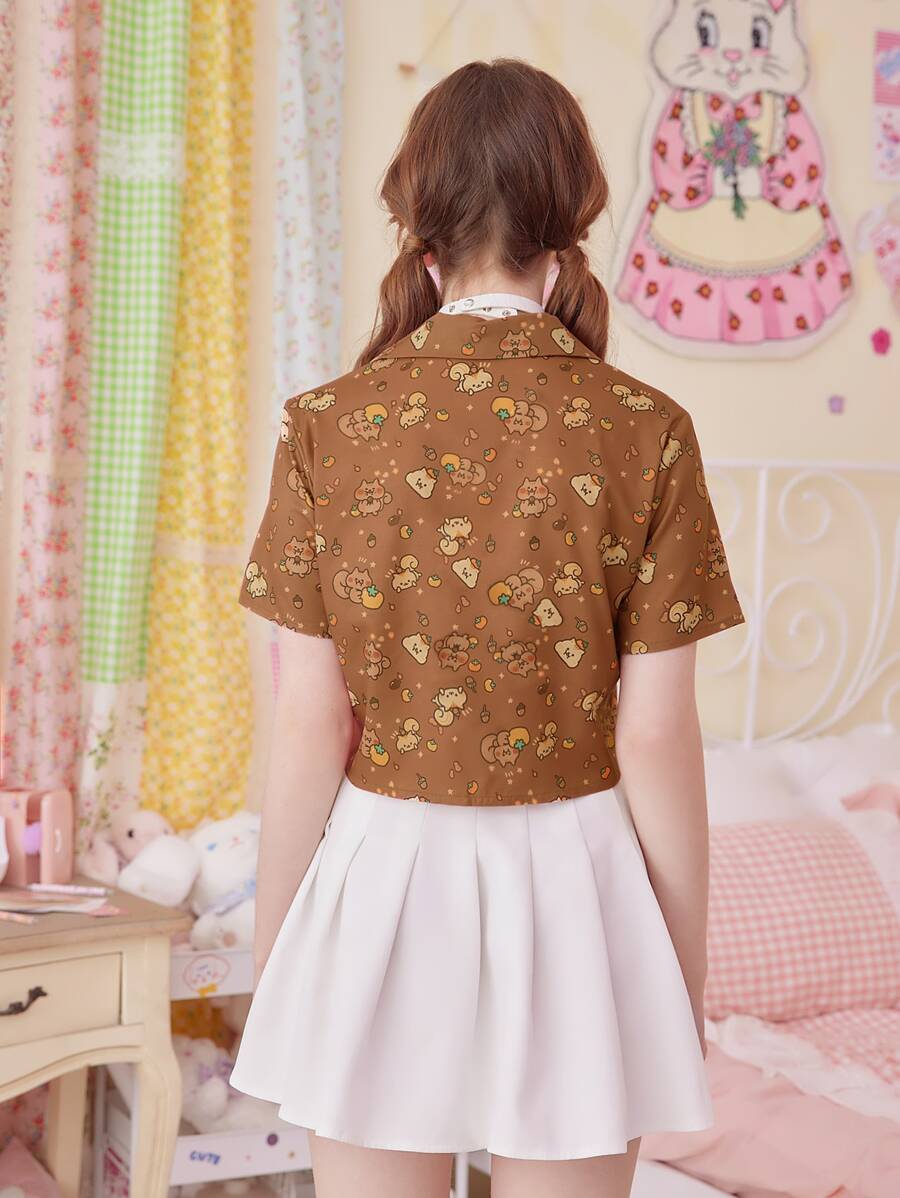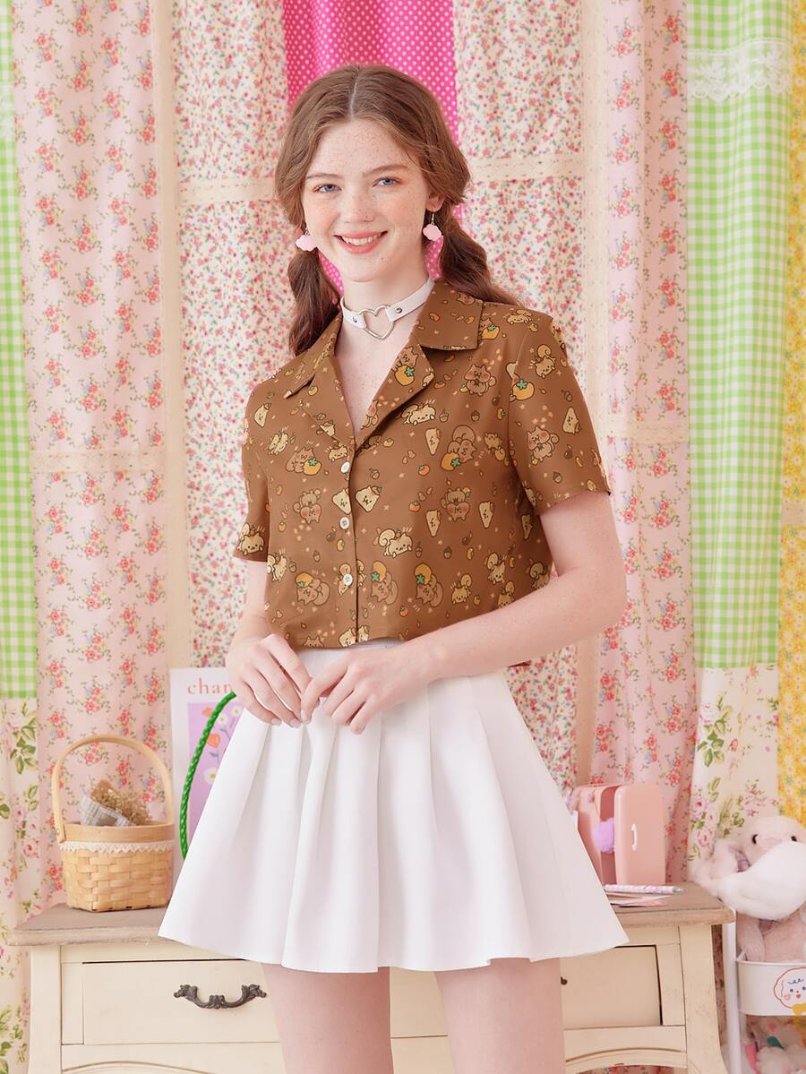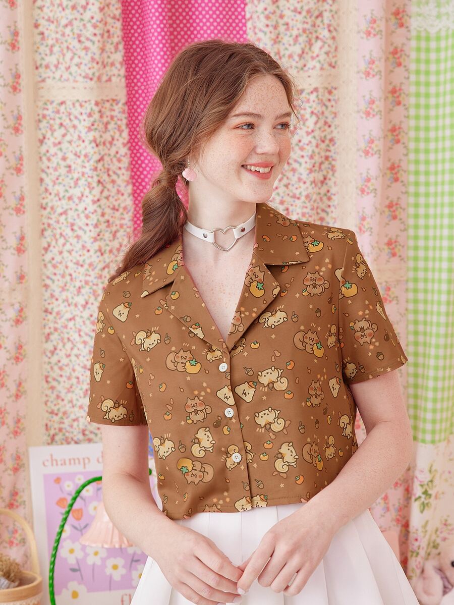Kawaii Cartoon Print Button Front Blouse