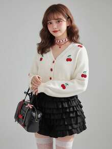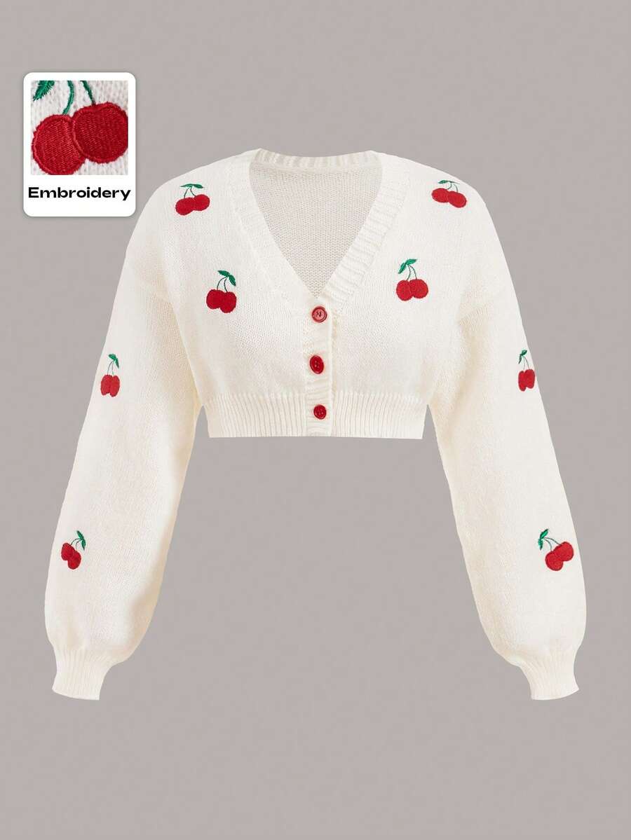Kawaii Cherry Embroidery Lantern Sleeve Crop Cardigan, School,Long Sleeve Tops