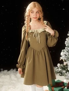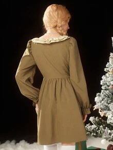 Kawaii Christmas Ruffle Trim Knot Flounce Sleeve Dress
