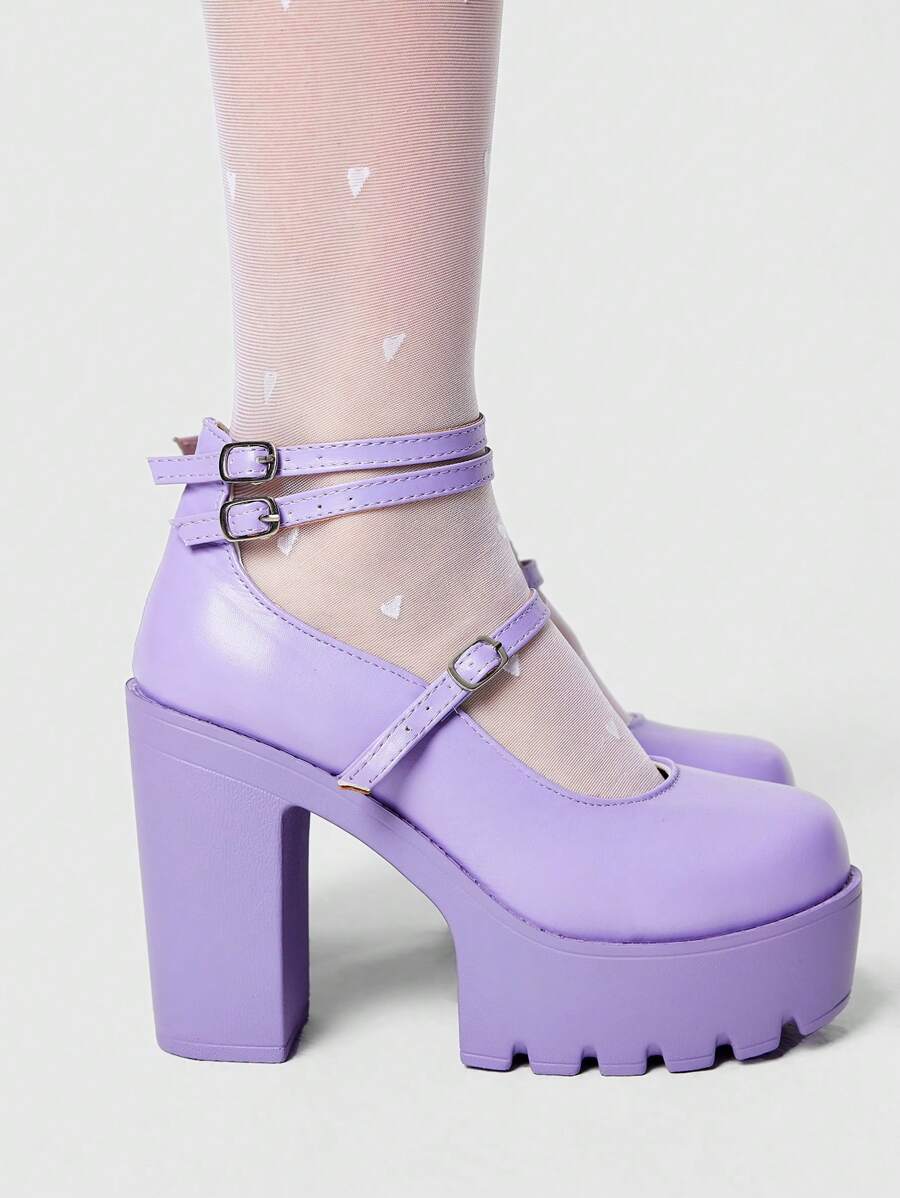 Kawaii Closed Toe Purple High Heels, Chunky Heel Mary Jane Shoes With Waterproof Platform, Multiple Buckle Accent Party Dress Pumps For Women Spring Shoes Spring Break Easter For Christmas