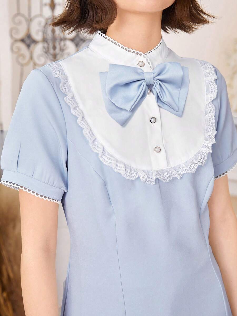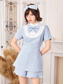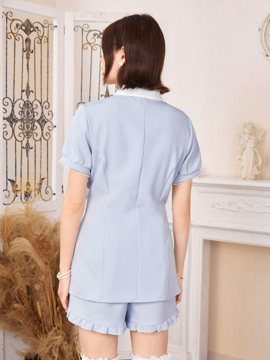 Kawaii Contrast Lace Button Front Blouse & Shorts