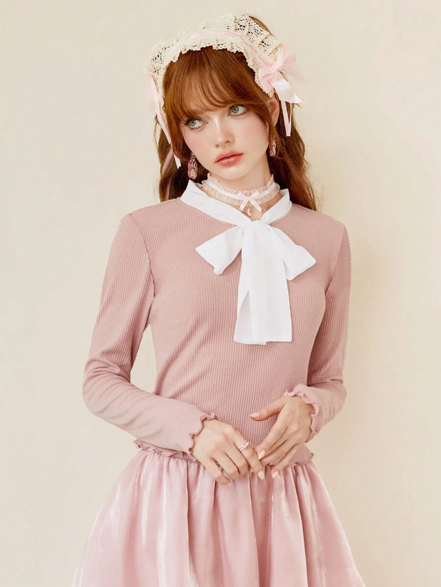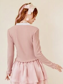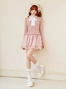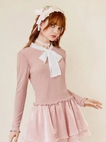 Kawaii Contrast Tie Neck Lettuce Trim Tee