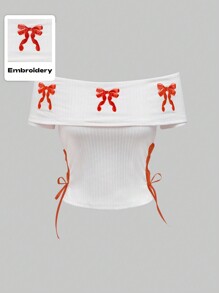 Kawaii Cute Bow Embroidered Waist Tie Off Shoulder Fitted Women T-Shirt