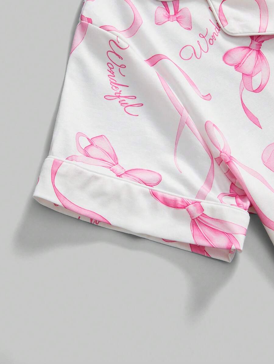 Kawaii Cute Bow Print Turndown Collar Short Sleeve & Shorts 2-Piece Casual Sleepwear Sets For Women, Summer