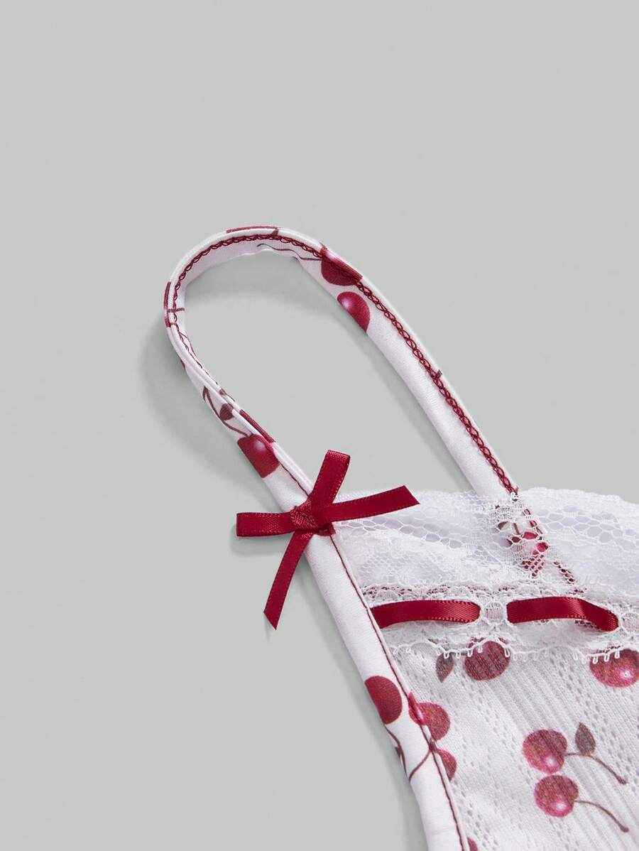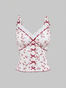 Kawaii Cute Country Style Cherry Contrast Lace Bow Design Fitted Women Tank Top