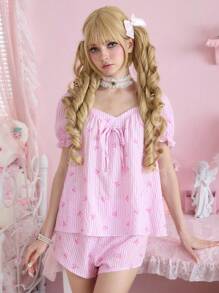 Kawaii Cute Girl Striped Bowknot Allover Print Puff Sleeve Comfortable Casual Summer Pajamas Set