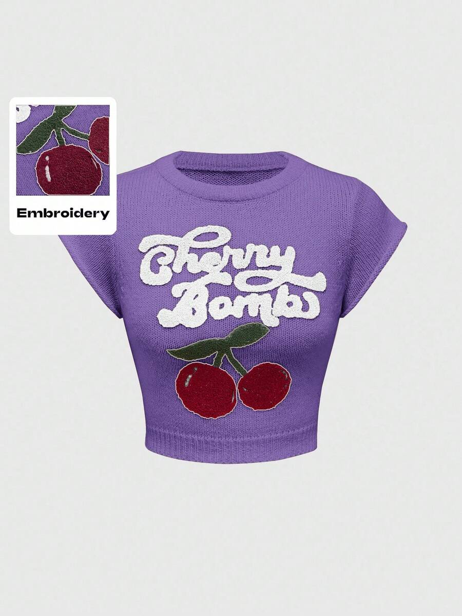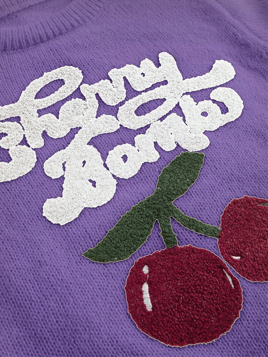 Kawaii Cute & Innocent Collegiate Style Cherry Embroidered High Neck Lantern Sleeve Women Sweater