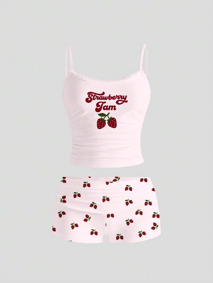 Kawaii Cute Strawberry Graphic Camisole & Lace Trim Sexy Shorts 2 Pieces Set For Women