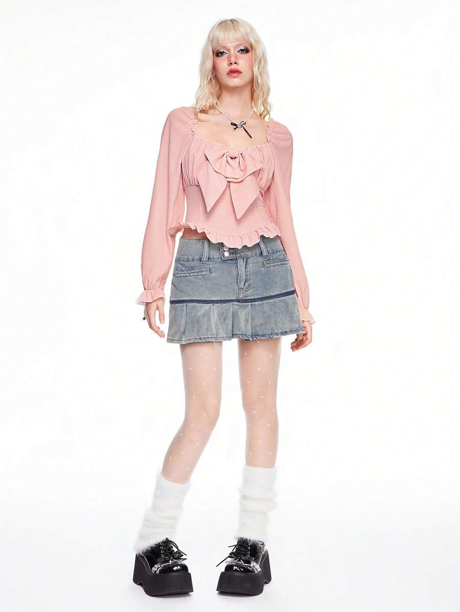 Kawaii Cute Sweet Bubble Long Sleeve Bow Decor Women Blouse