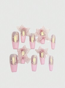 Kawaii Cute, Sweet Lace Bow Design Pink Elegant French Romantic Pearl Gloss Pearl Long Square Manual Fake Nails