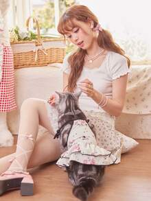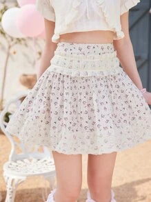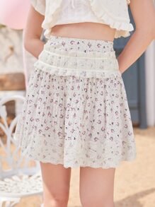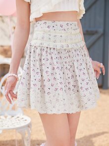 Kawaii Ditsy Floral Print Contrast Lace Skirt