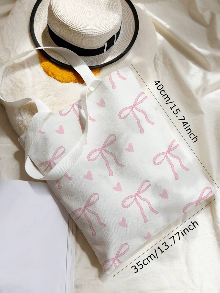 Kawaii Double Side Printed Bow & Heart Design Canvas Tote Bag, Artistic Style School Bag & Book Bag For Women Or Students, Perfect For Books, Shopping, Back To School And More