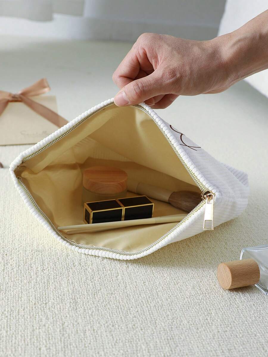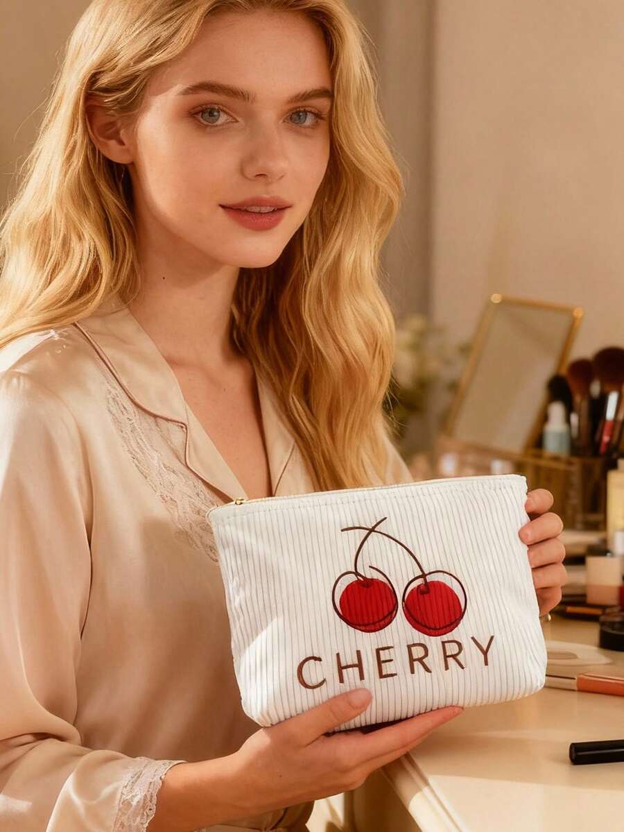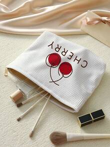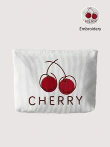 Kawaii Embroidered Cherry Cartoon Velvet Zipper Makeup Bag, Lightweight And Multifunctional Lined Cosmetic Storage Bag