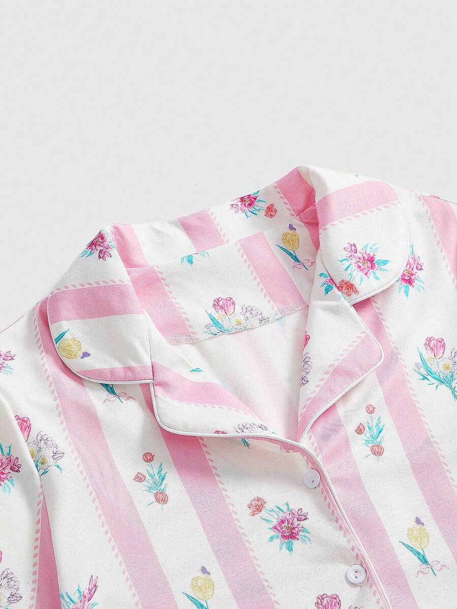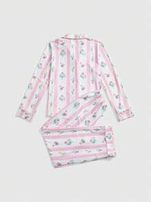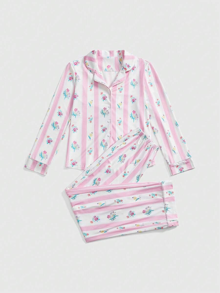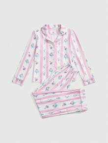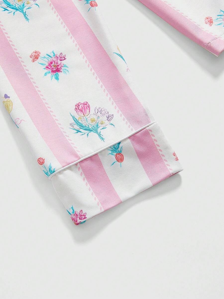 Kawaii Floral & Stripe Print Lapel Collar Long Sleeve Top & Pants Casual Women Pajama Set
