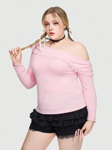 Kawaii Lace Trimmed Oblique Shoulder Plus Size T-Shirt For Women