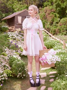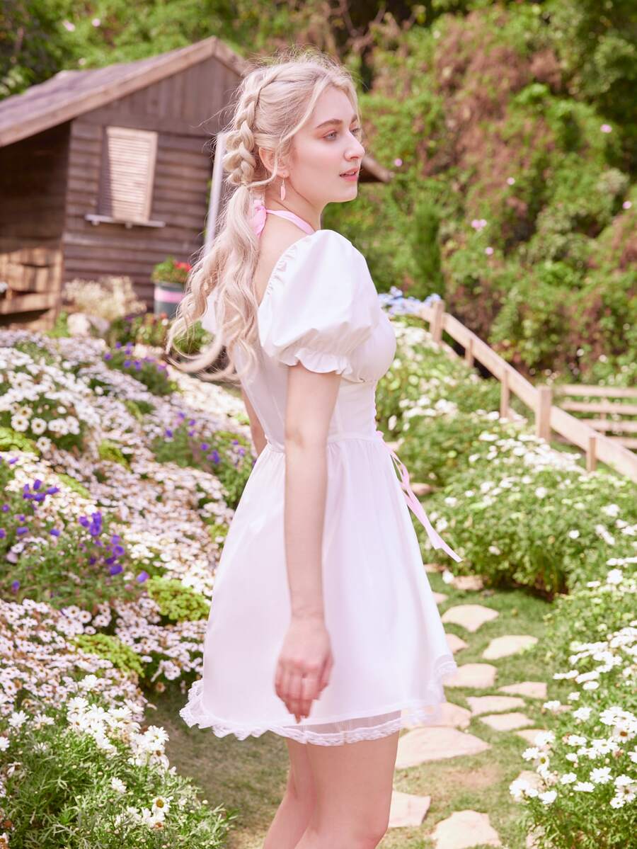 Kawaii Lace Up Contrast Lace Puff Sleeve Dress
