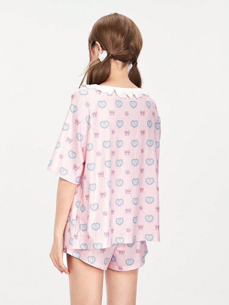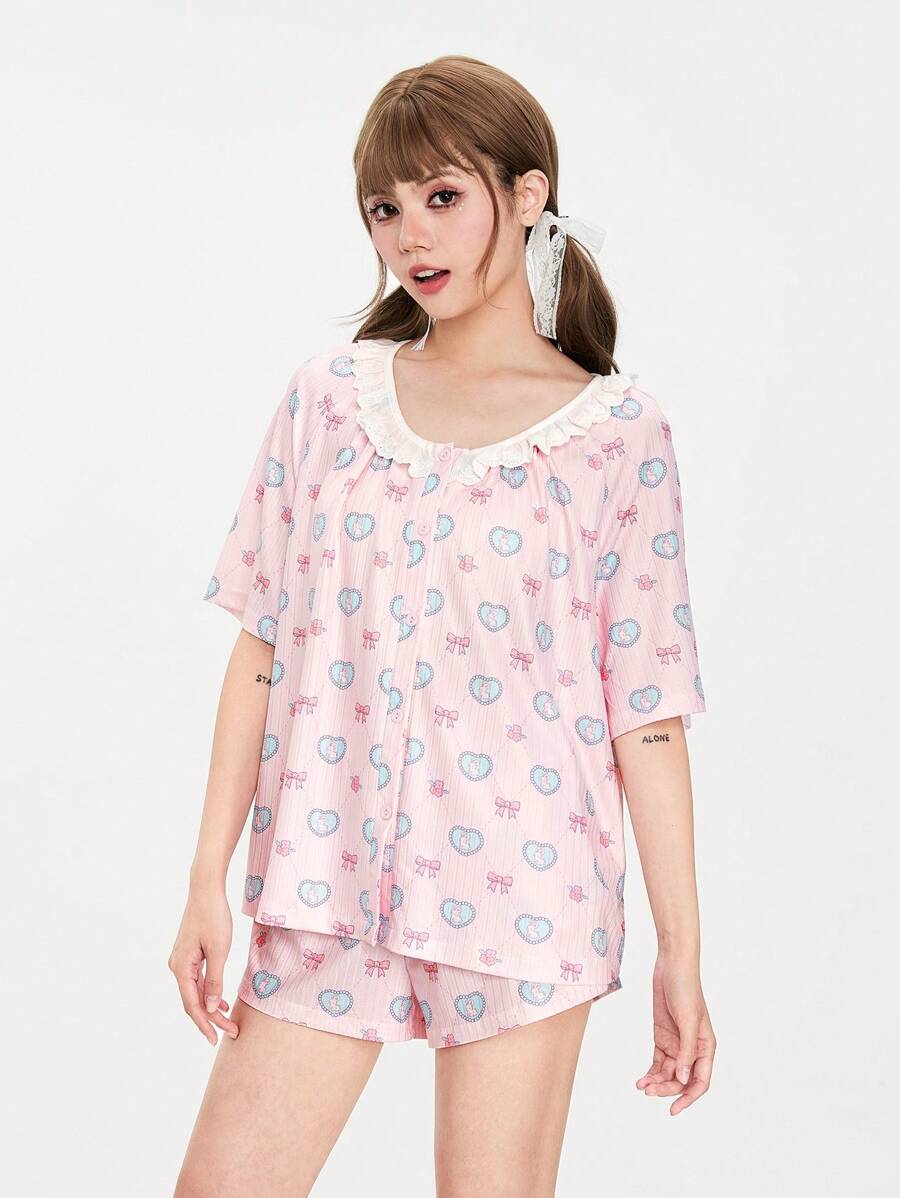Kawaii Lovely Girls' Knitted Camisole Set With Bowknot, Bunny Print And Lace Patchwork For Women's Sleepwear