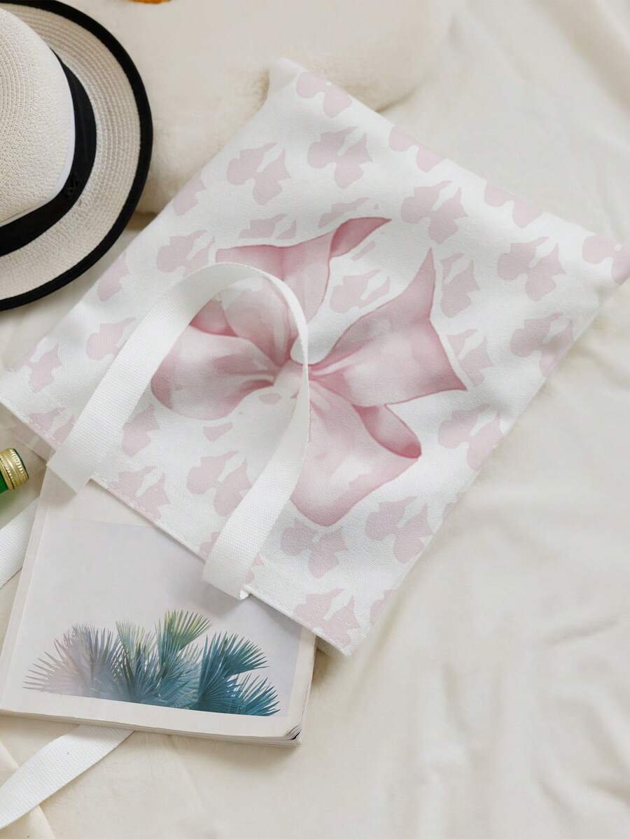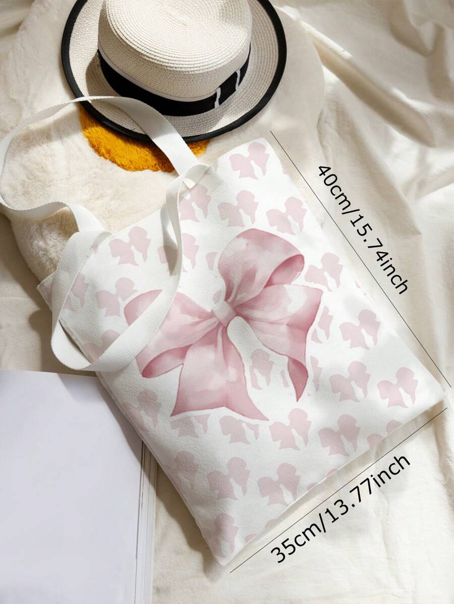 Kawaii Lovely Pink Bowknot Print Double-Sided Shoulder Canvas Bag Valentines, Cute Bow Bag For Women