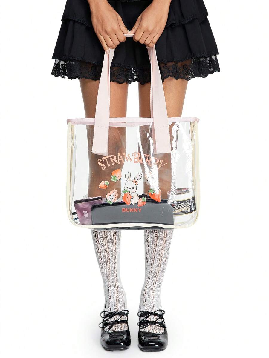 Kawaii Macaron Color Tote Bag With Strawberry & Rabbit Print, Transparent Beach Shoulder Bag, & Cute Strawberry Purse