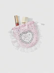 Kawaii Mesh Floral Lace Cute Cat & Bow Pattern Large Capacity Drawstring Cosmetic Bag, Makeup Pouch 999058