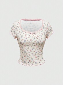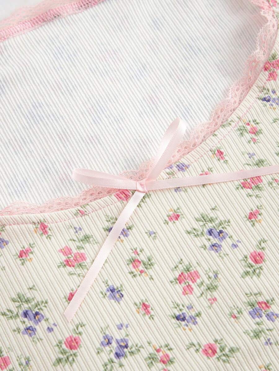 Kawaii Mori Girl Casual Minimalist Sexy Ditsy Floral Dotted Splicing Bowknot T-Shirt