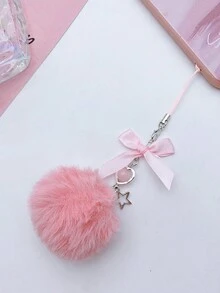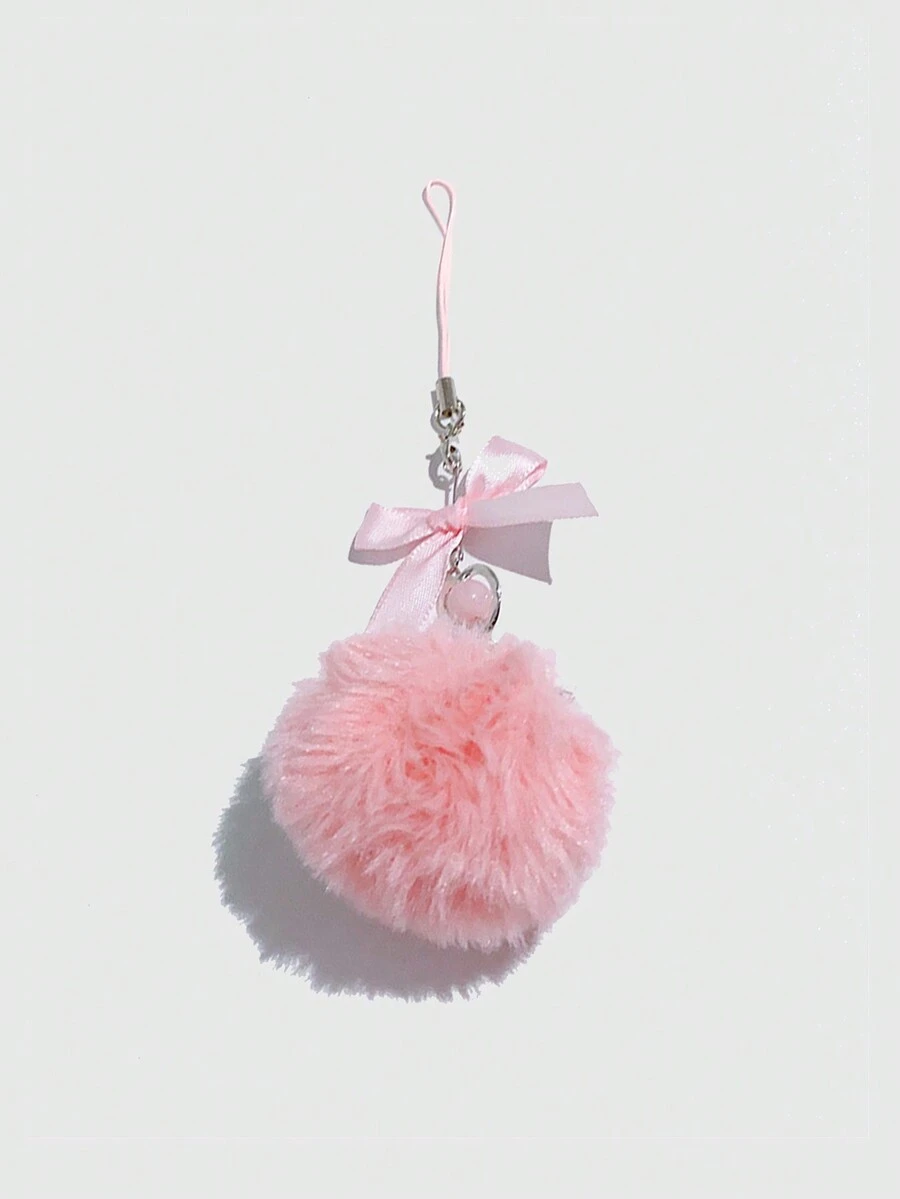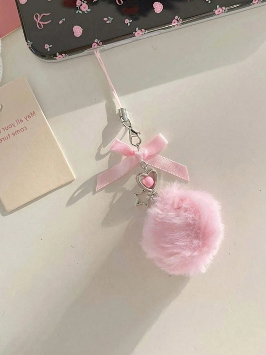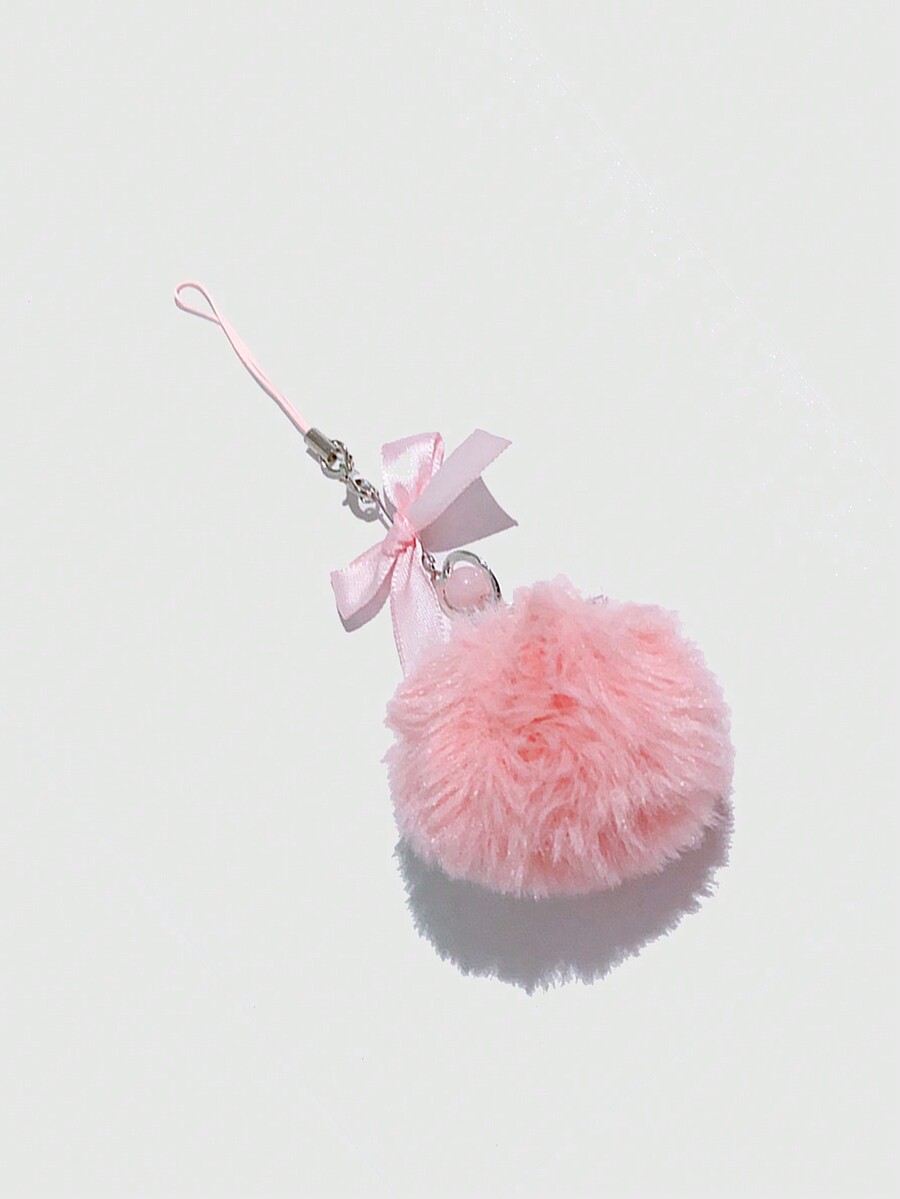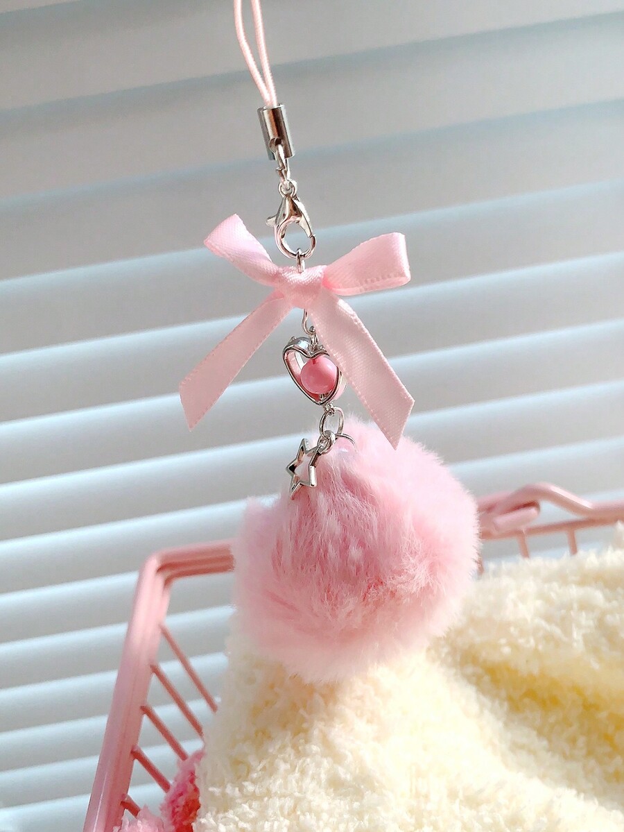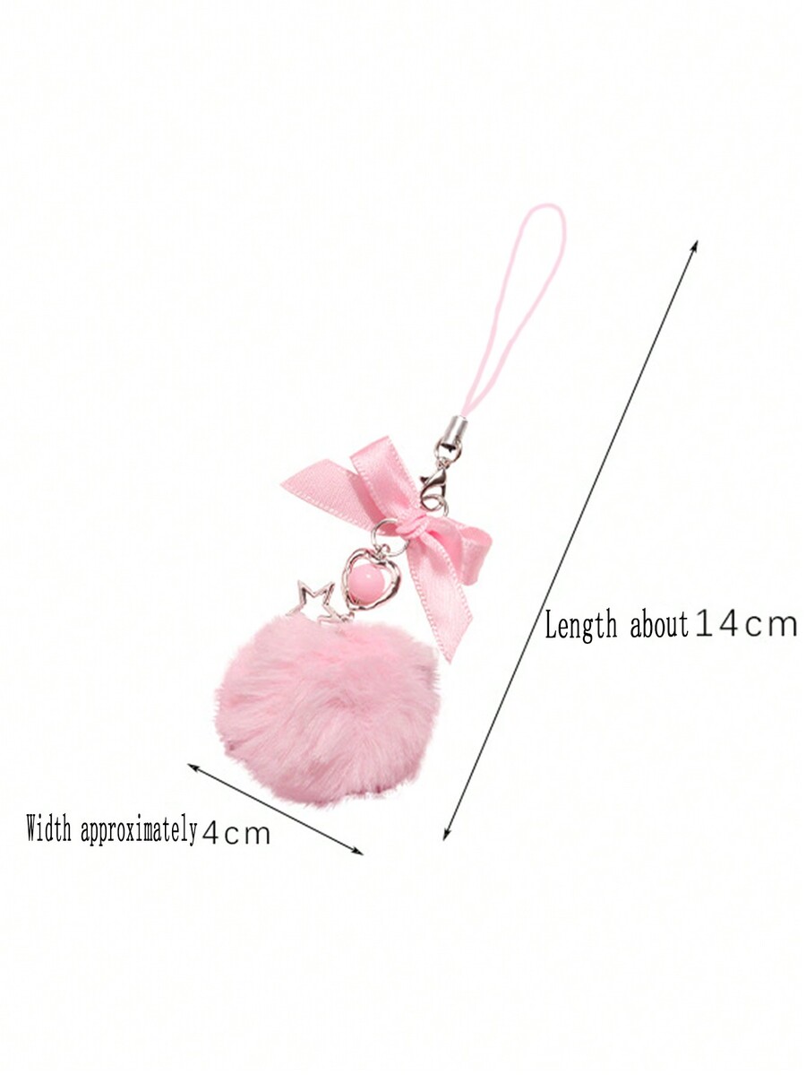 Kawaii Pink Fur Ball Woven Ribbon Bow Keychain, Multi-Purpose Chain For Hanging On Bags, Phones And Cameras