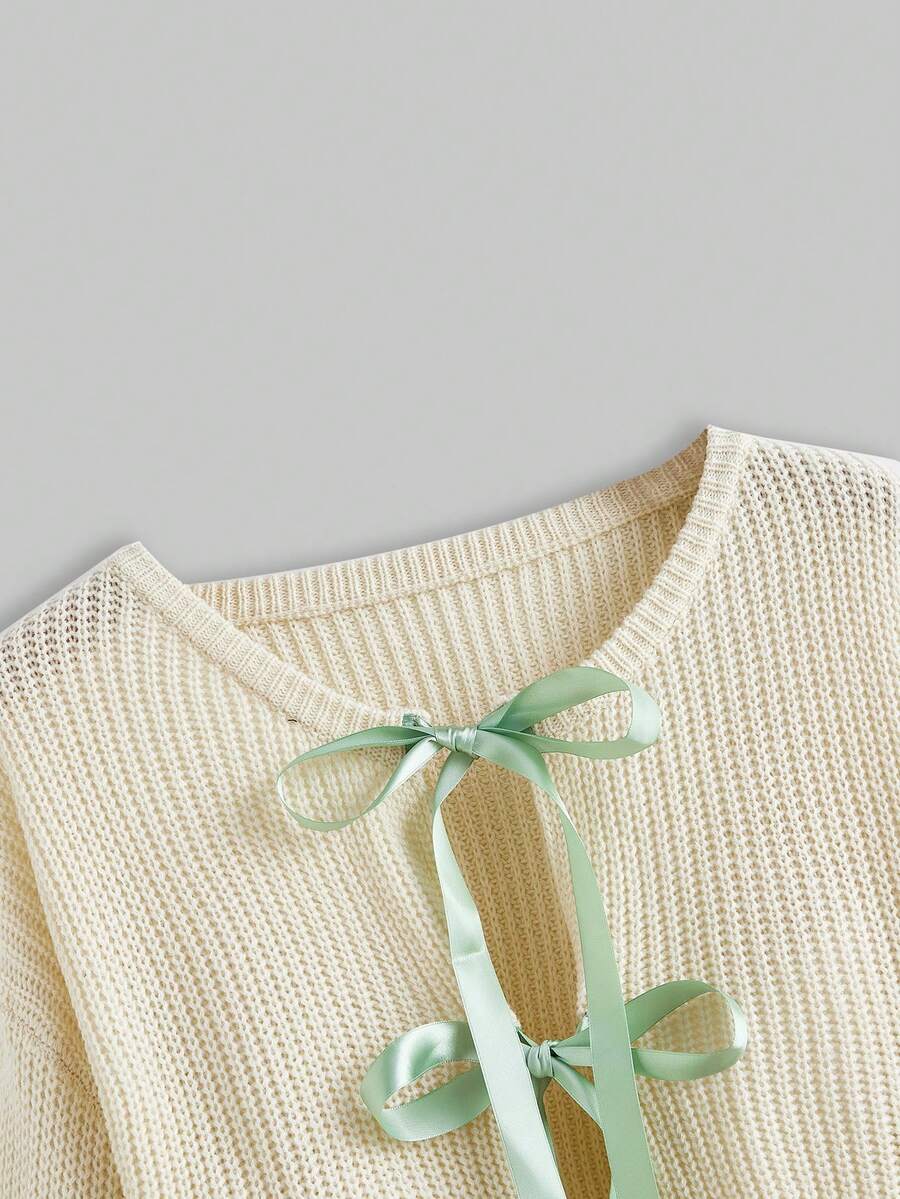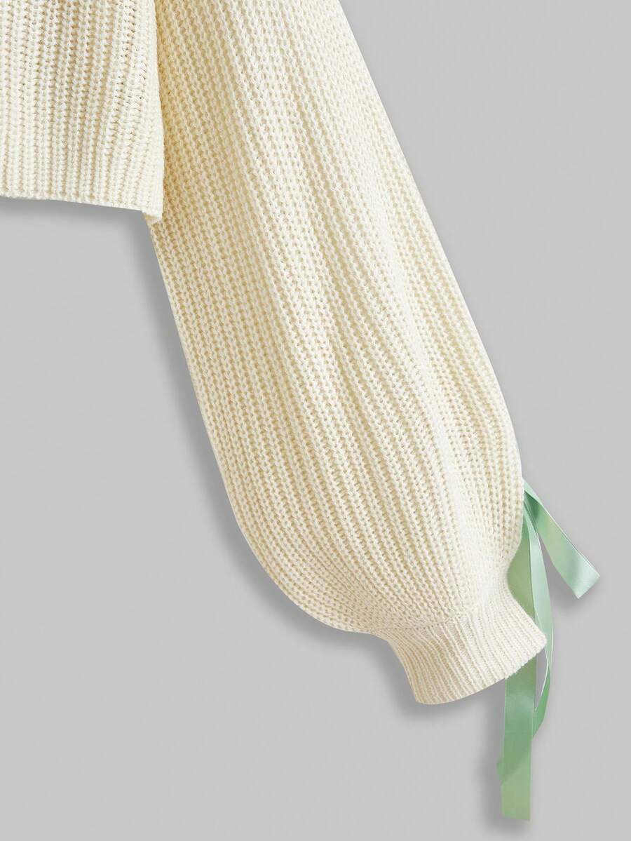 Kawaii Plus Size Cute Bow Decor Lantern Sleeve Women's Knitted Cardigan Sweater Coat