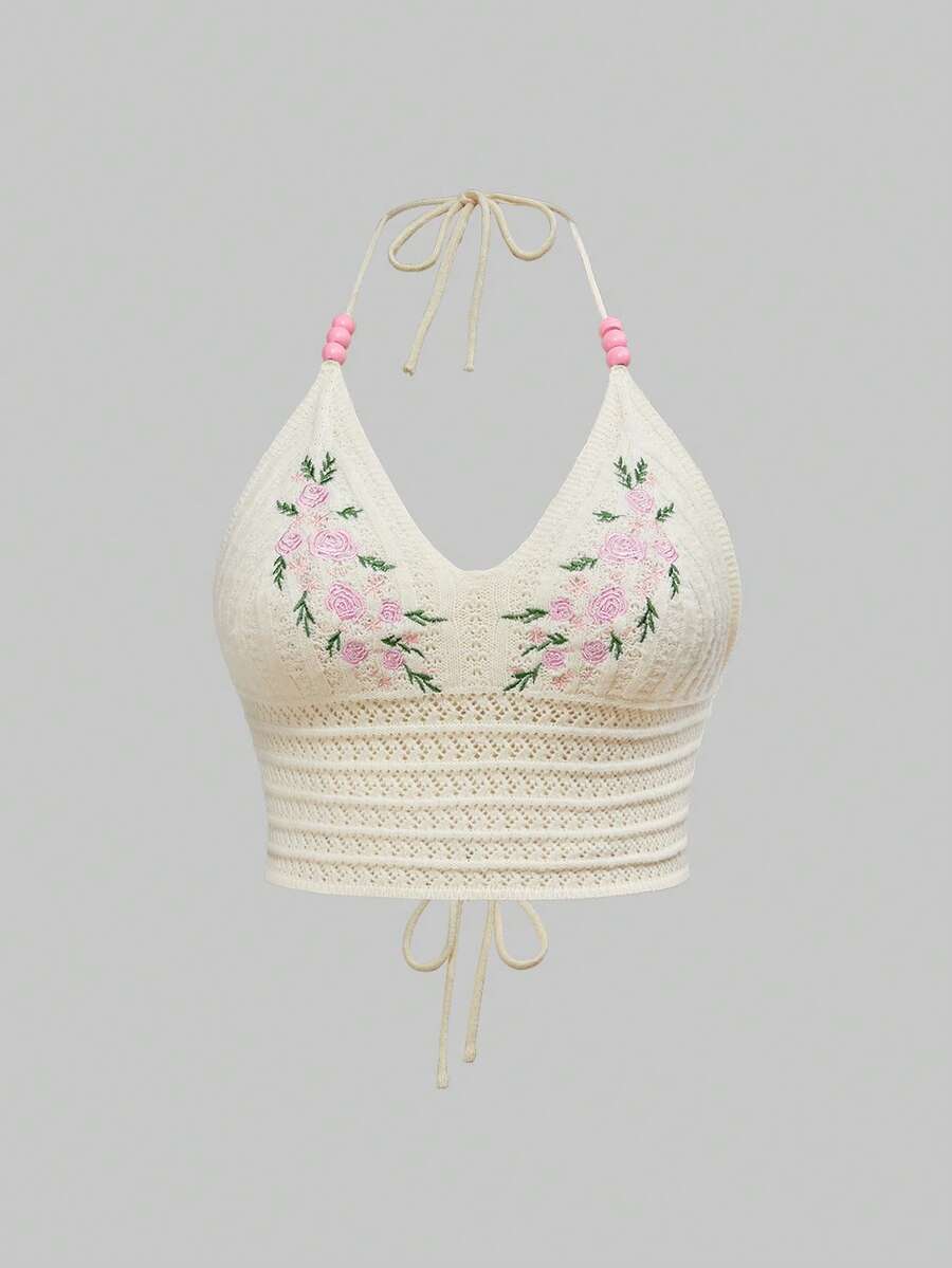 Kawaii Plus Size Halter Neck Floral Embroidered Knit Top, Spring Break