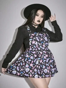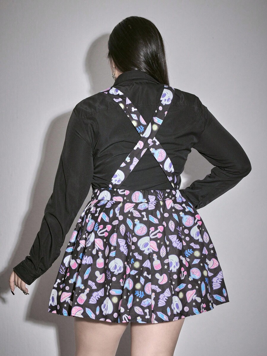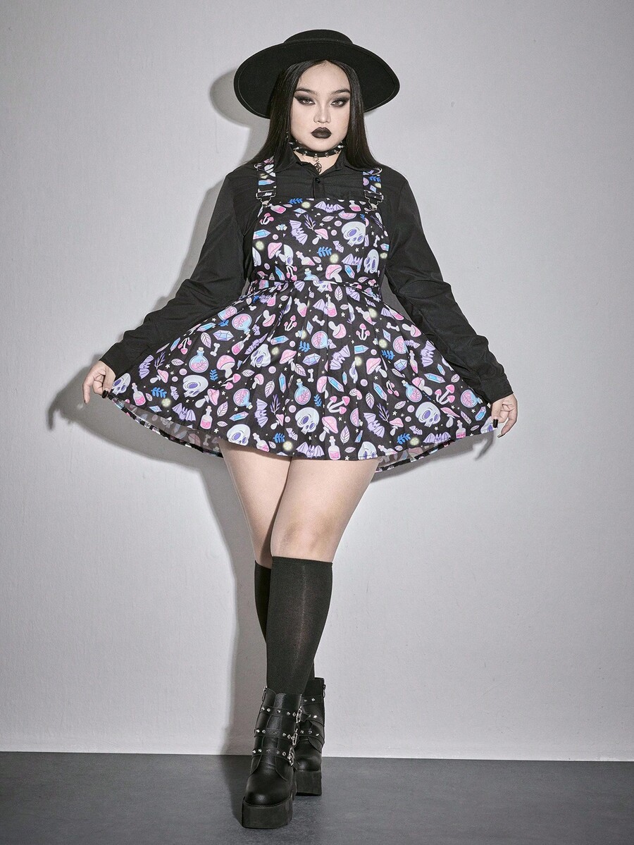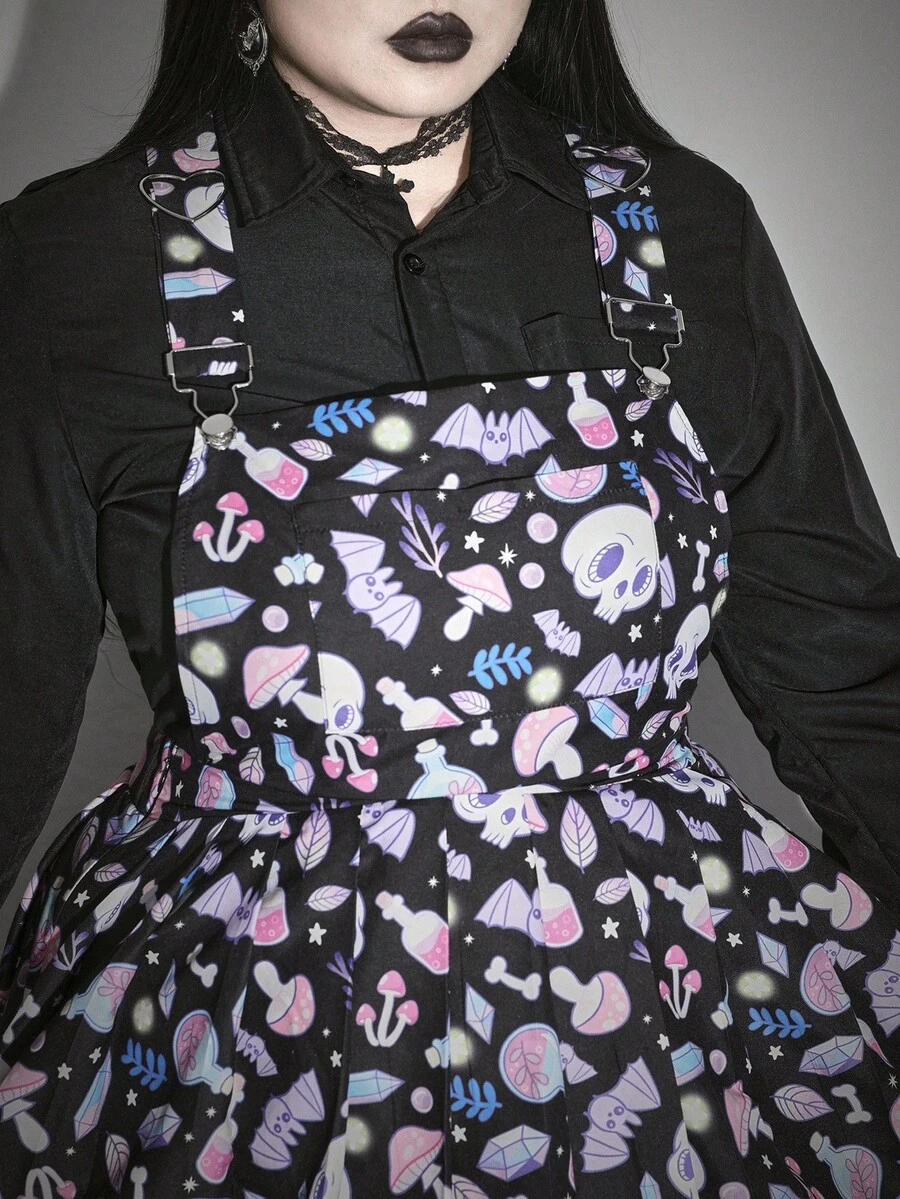 Plus Size Kawaii Dark Lolita Style Pleated Skirt Skull & Potion Bottle Print Suspender Dress
