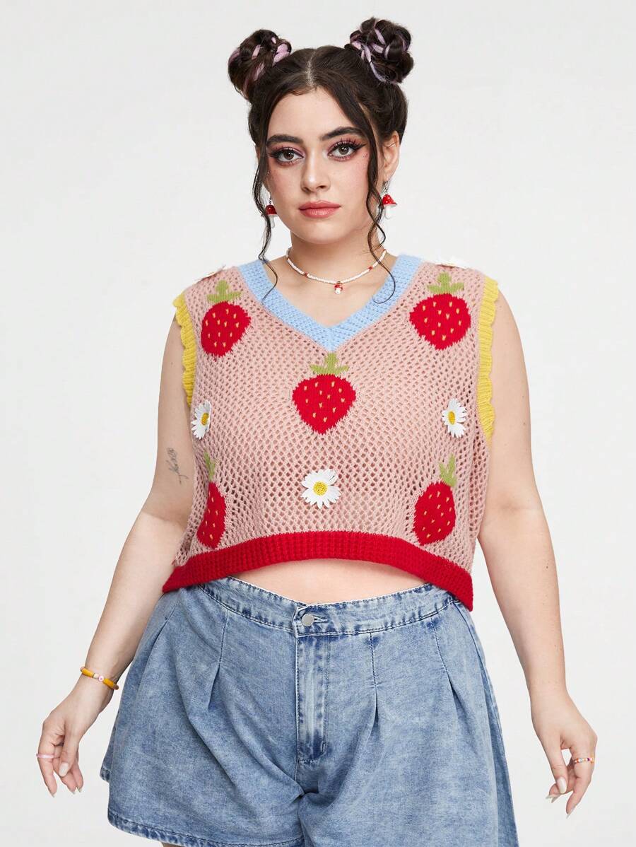 Kawaii Plus Size Strawberry Pattern Color Block V-Neck Hollow Out Knitted Fashion Summer Sweater Vest