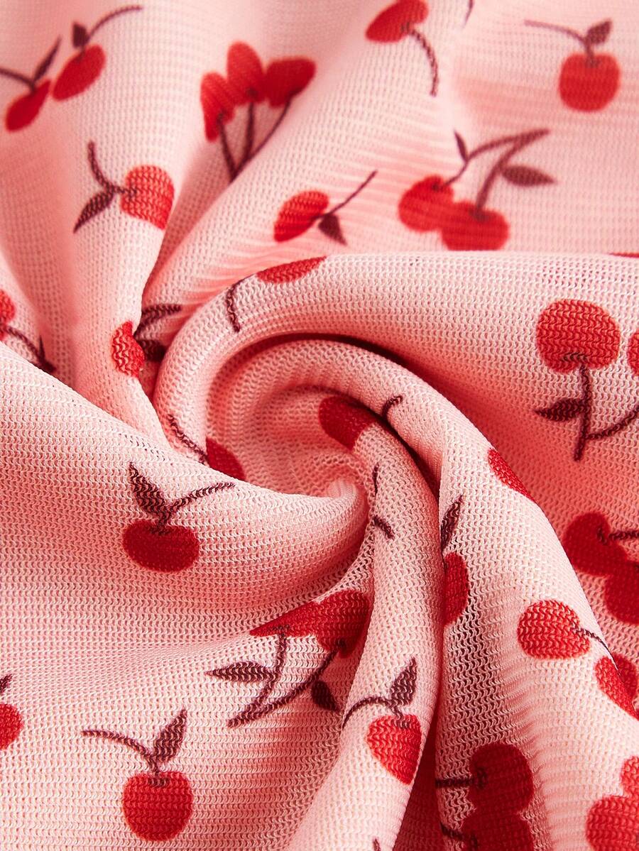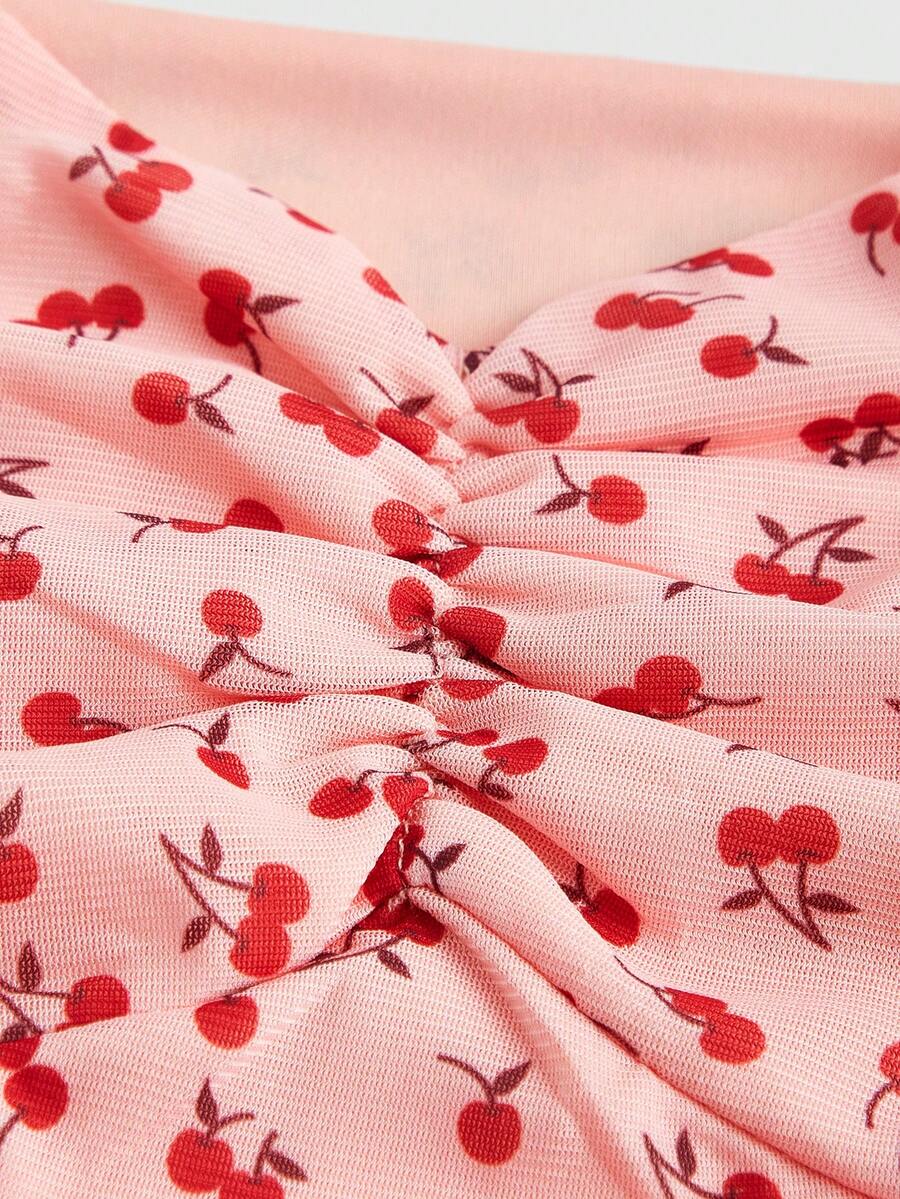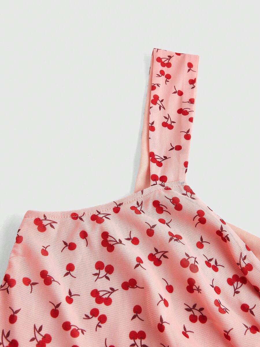 Kawaii Plus Size Summer Casual Cherry Blossom Allover Print Mesh Ruched Tank Top