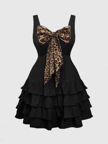 Kawaii Plus Size Vintage Sheer Chiffon Leopard Print Bowknot Ruffle Hemline Dress