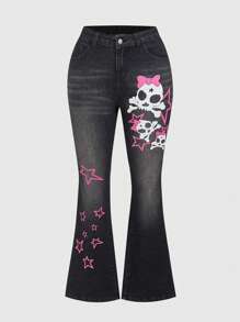 Kawaii Plus Size Women's Retro Y2K Subculture Shibuya Gyaru Skeleton & Star Print Denim Jeans