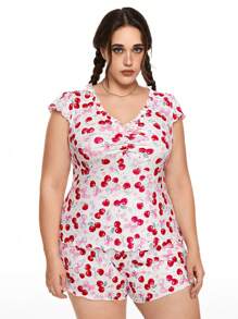 Kawaii Romantic Cherry Butterfly Floral Plus Size Short Sleeve Pyjamas Set With Ruffled Edge