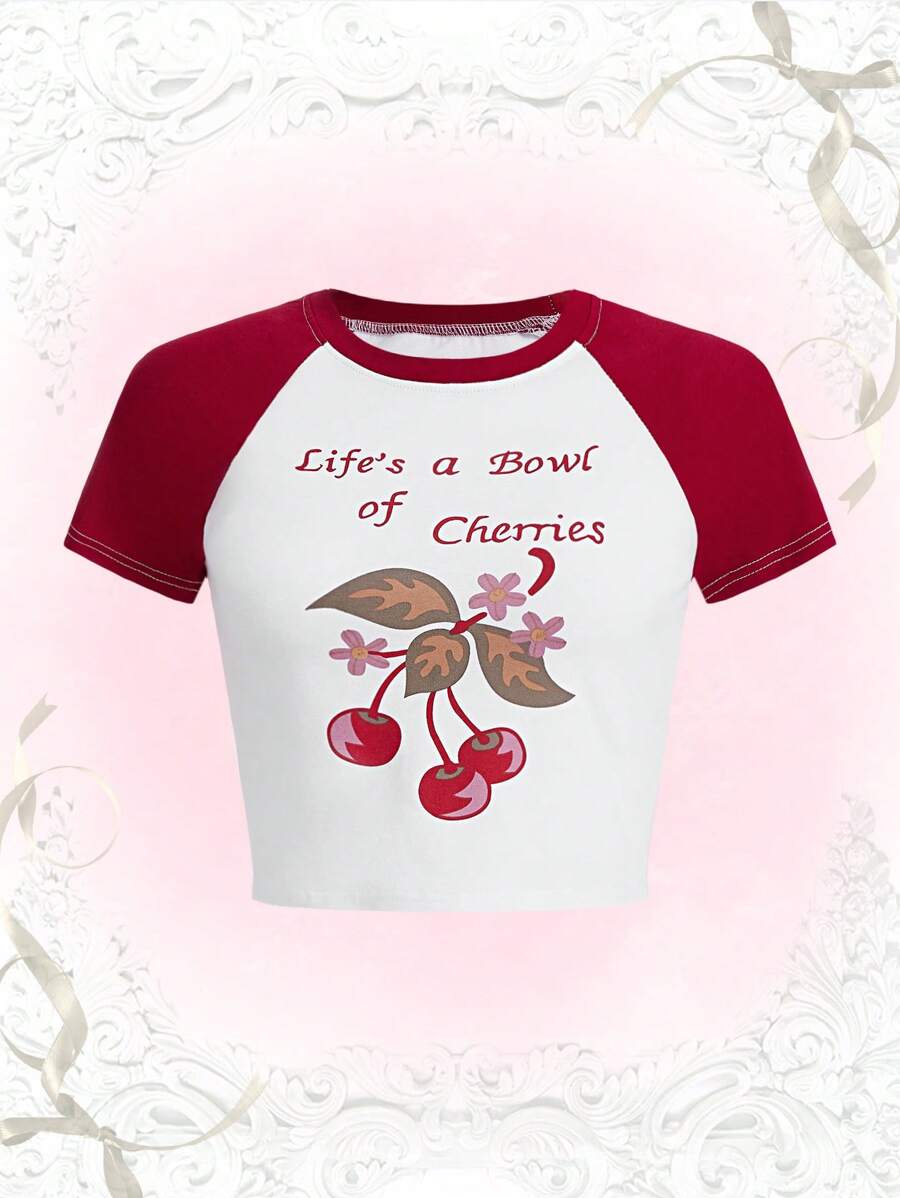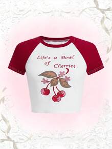 Kawaii Slogan Cherry Graphic Colorblock Tee