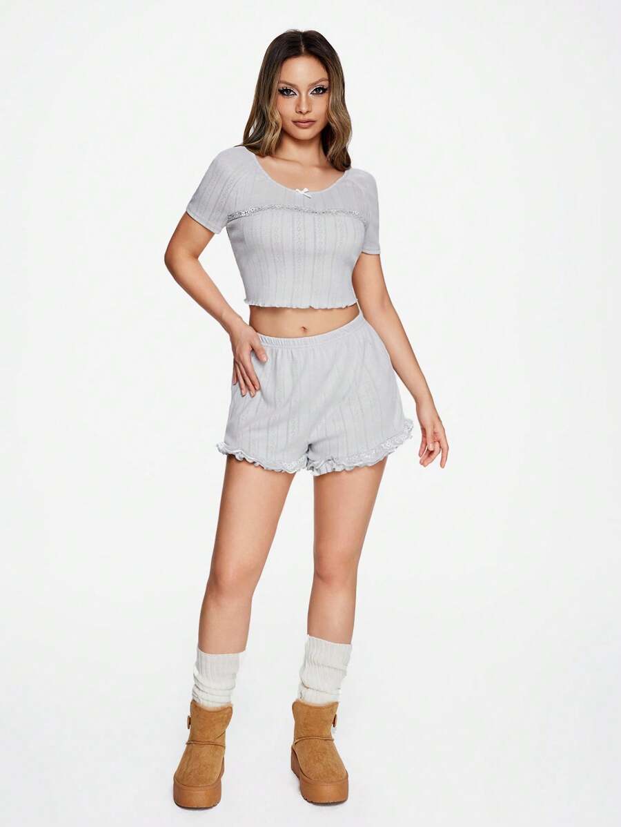 Kawaii Soft And Skin-Friendly Breathable Knitted Texture Lace Patchwork Bow Decor Women Pajama Set