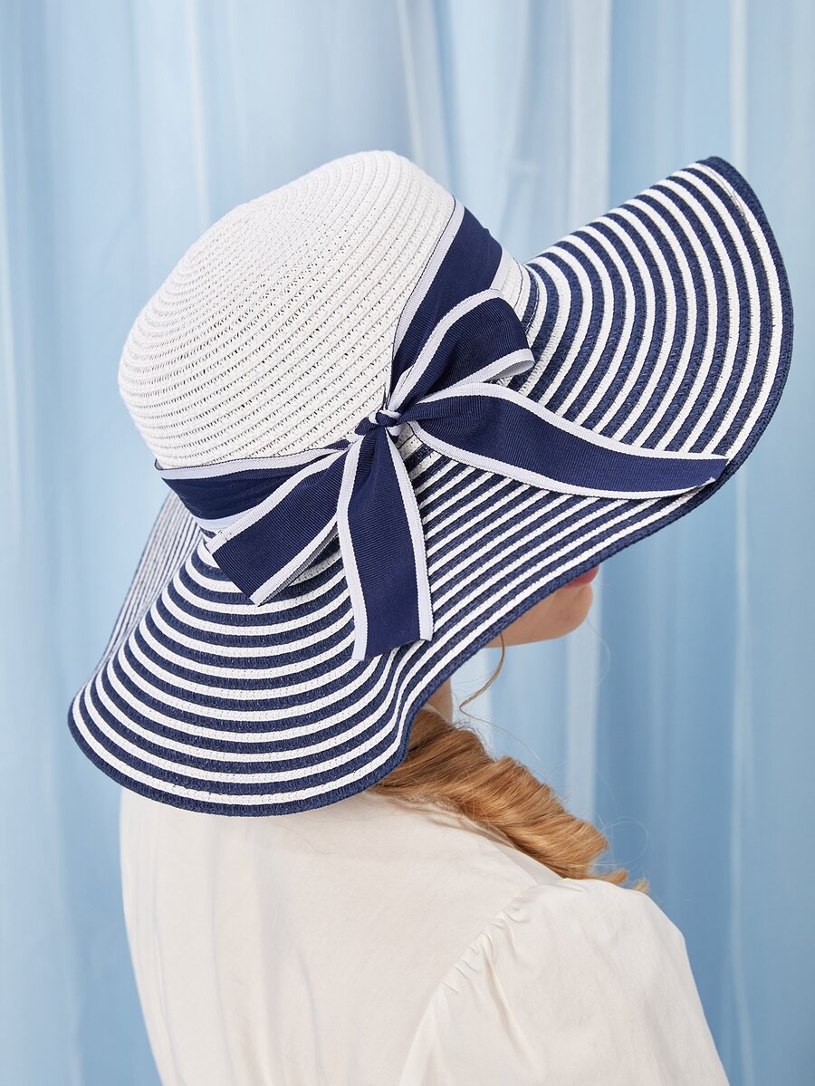 Kawaii Striped Pattern Bow Decor Straw Hat