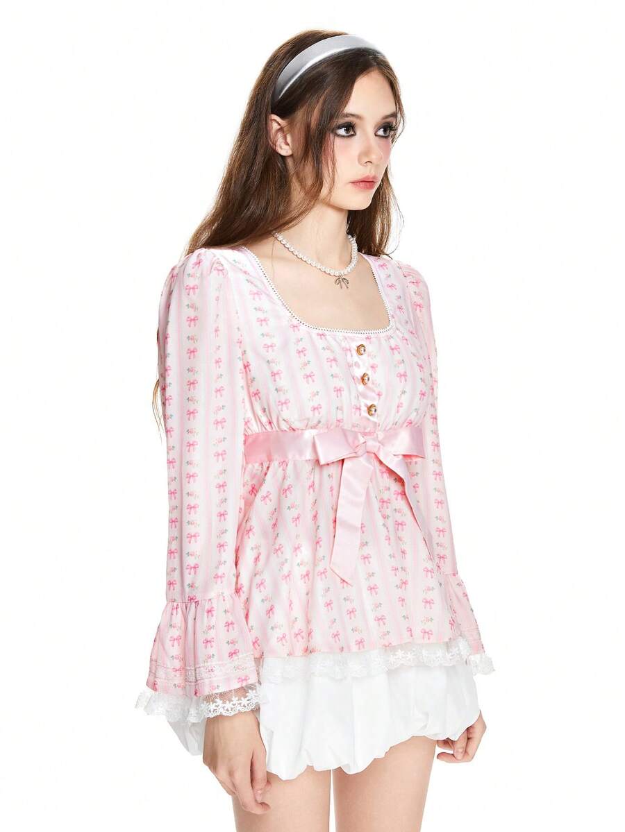 Kawaii Vintage Lace Girly Bow Print Tie Front Women Blouse