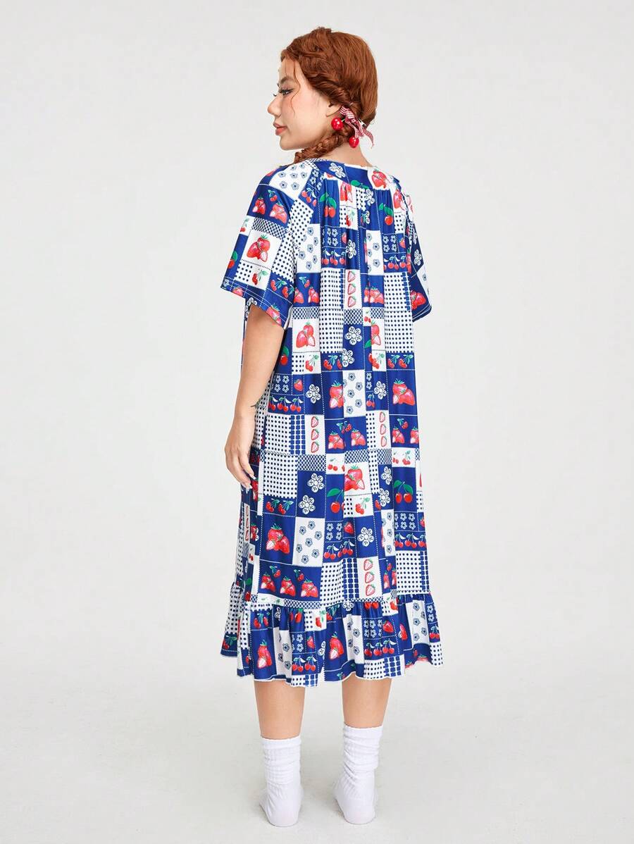 Kawaii Vintage Style Family Time Strawberry Print Patchwork House Dress
