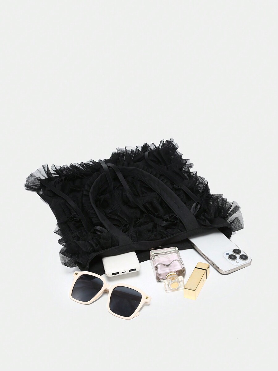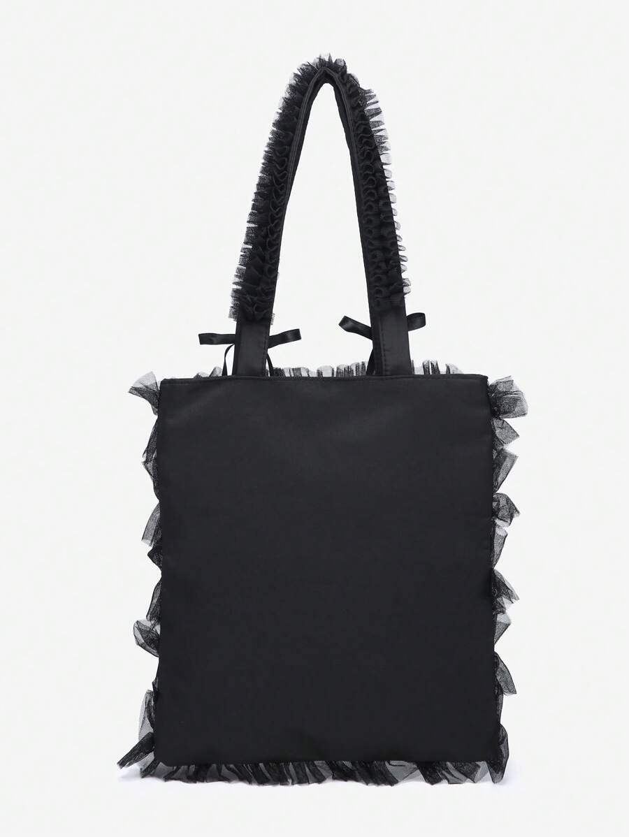 Kawaii Vintage Style Women's Holiday Mesh Tote Bag With Ruffle Edge And Large Bowknot Decoration, Cute Bow Bag For Women