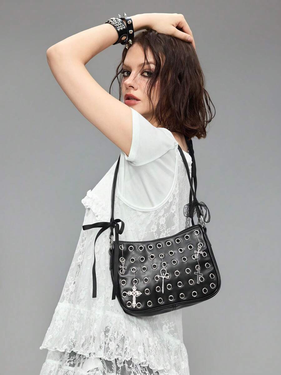 Kawaii Vintage Y2K Women Pentagram Cross Metal Decor Bow Cherry Shoulder Underarm Purse
