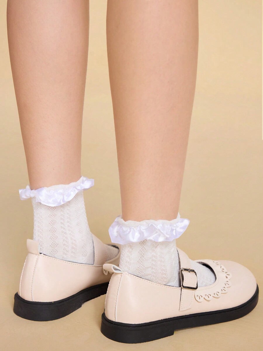 Kawaii Women Beige Round Toe 3cm Vintage British Sweet Ruffle Mary Jane Flat Casual PU Leather Shoes, Versatile Japanese School Style