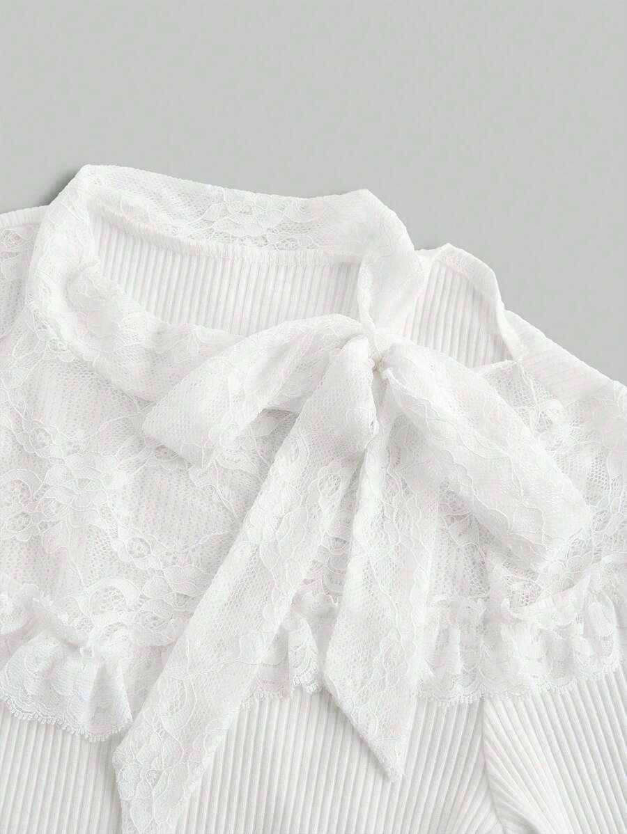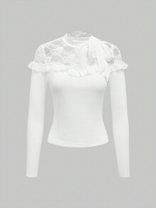Kawaii Women Solid Color Lace Patchwork Long Sleeve Casual Blouse, Everyday Wear