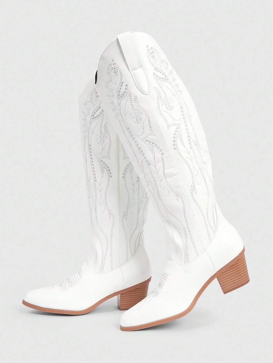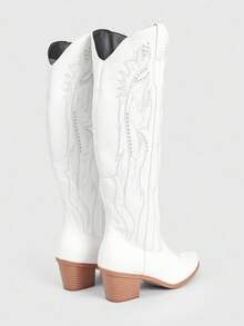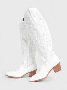 Kawaii Women's 2025 Spring/Autumn New Pointed Toe Chunky Heel Embroidered Western Boots, Leather Outdoor Fashion Slip-On Knee-High Boots