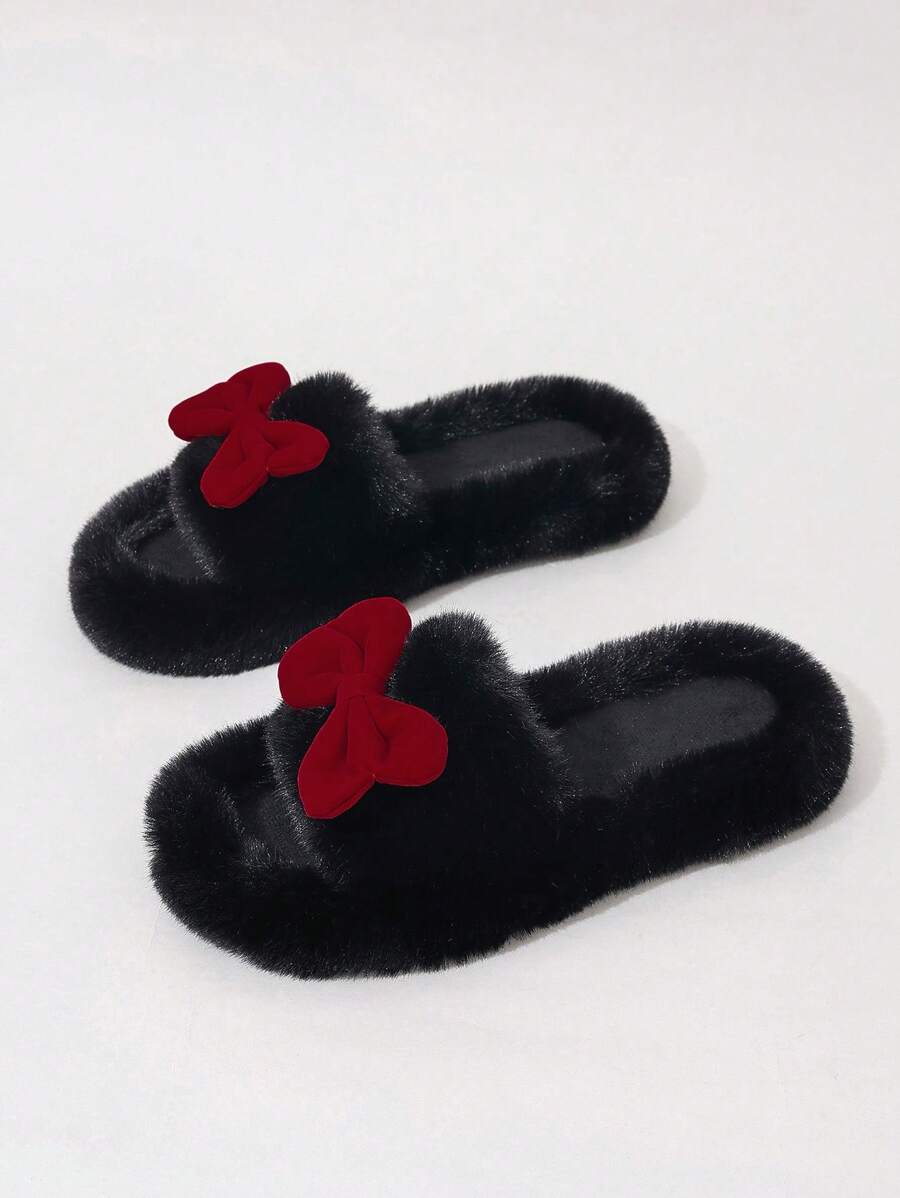 Kawaii Women's Black Cute Bow Fluffy Slip-On Slippers, New For Autumn/Winter 2024, Warm & Comfortable Flat House Slides For Christmas And New Year Holiday Vibe Fall And Winter