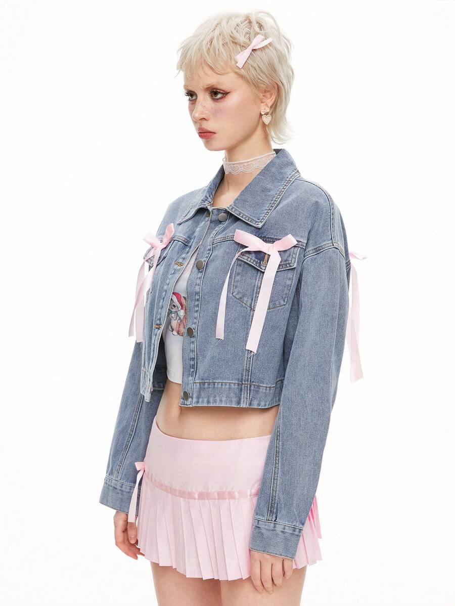 Kawaii Women's Casual Denim Jacket With Bowknot Decor, Dropped Shoulder, Long Sleeve, Spring & Autumn, School
