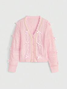 Kawaii Women's Cute Girly School Style V-Neck Lace Trim Ribbon Tie Bow Knitted Cardigan