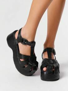 Kawaii Women's Dark Mary Jane Small Leather Shoes, Hollow Woven Mule Shoes, Floral Closed Toe Platform & Wedge Sandals