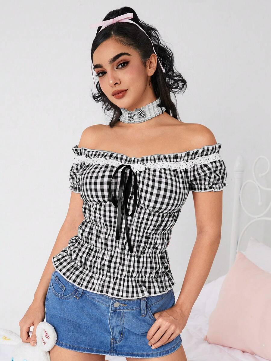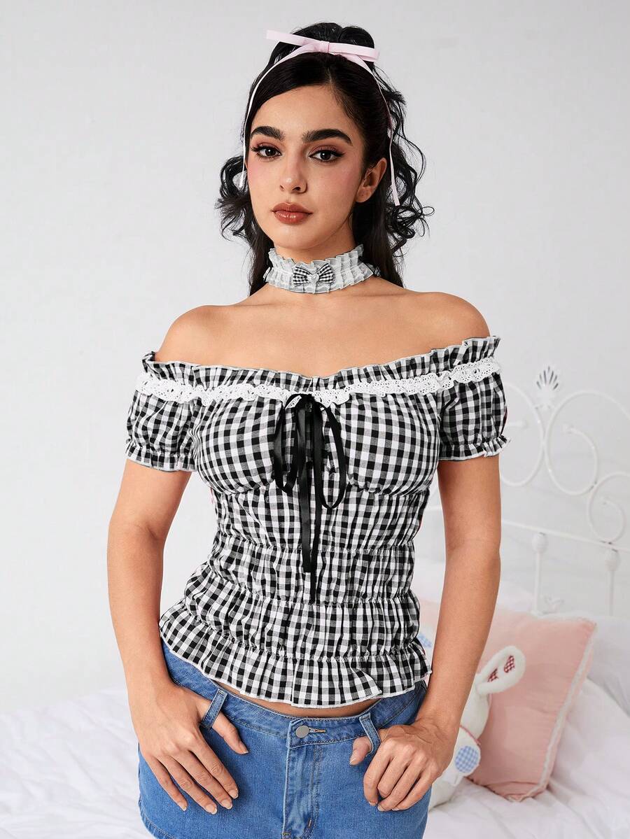 Kawaii Women's Elegant Sweet Off-Shoulder Ruffle Plaid Blouse